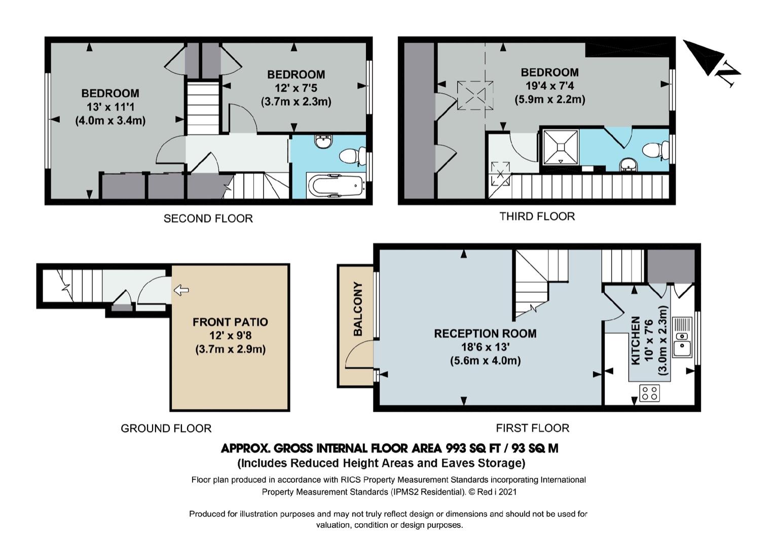 The accommodation comprises: private front door with stairs leading to 18'8 reception room with dining area, private balcony, fully fitted kitchen, stairs to second floor, 13' bedroom with built-in wardrobes and storage cupboard, 12' bedroom with built-in storage cupboard, family bathroom, stairs to top floor, 19'4 guest bedroom suite with under-stairs storage, en-suite shower room and paved patio garden area.