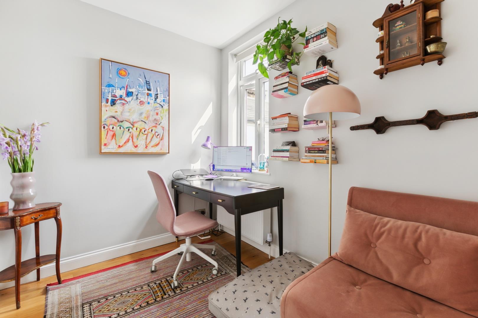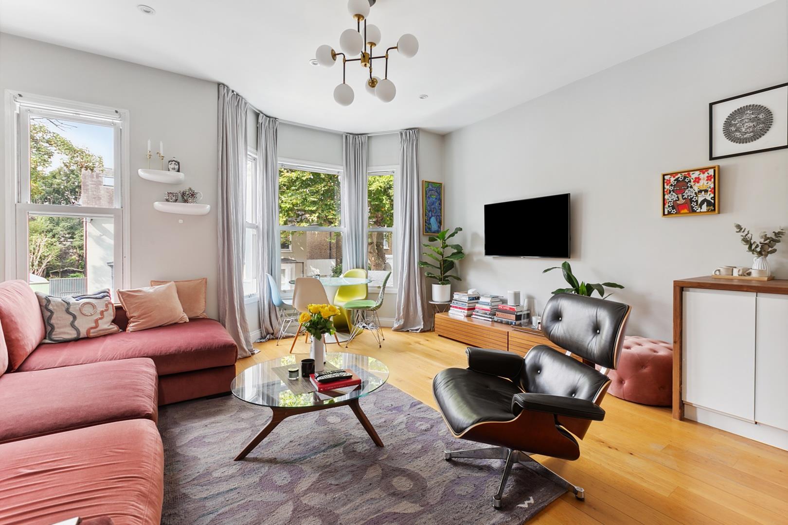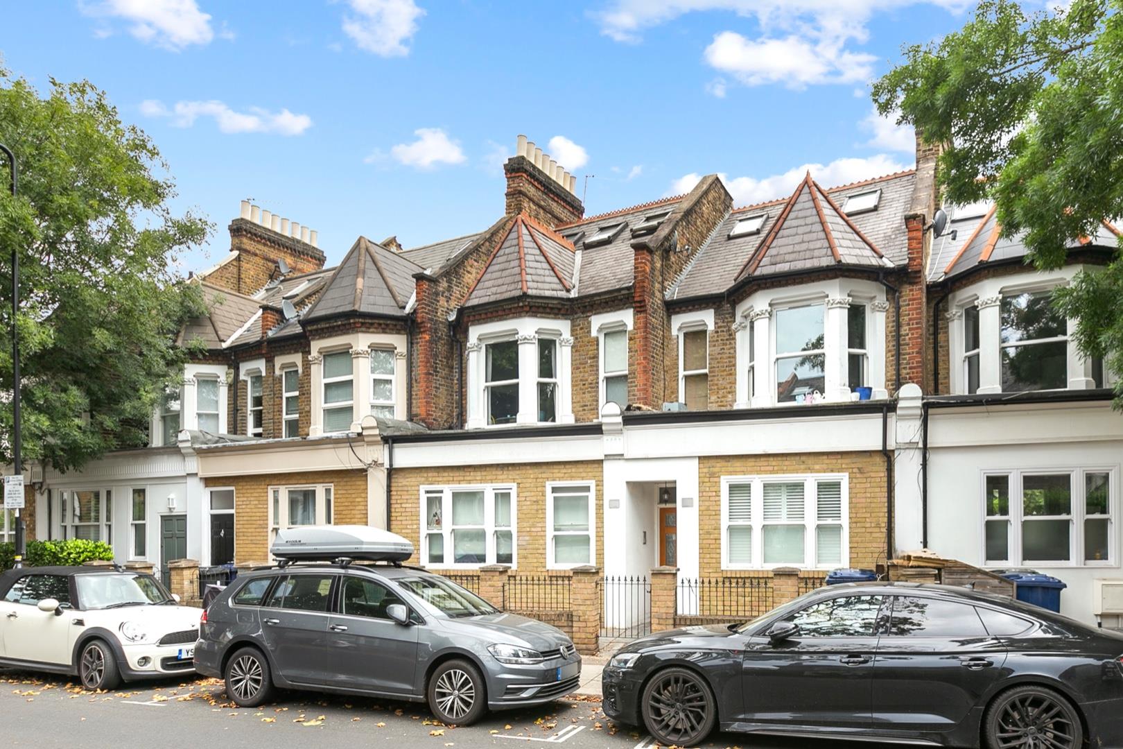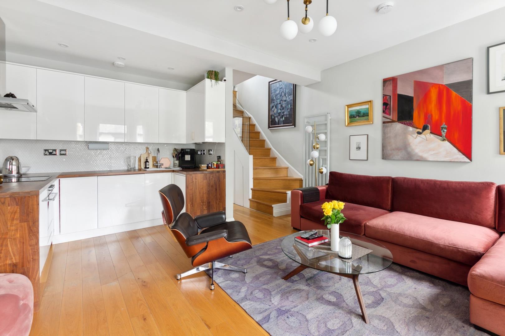 Entrance hallway with bespoke under-stairs storage cupboards leading to 19'4 reception room with dramatic four sash window bay and front facade. Recently refurbished fully fitted contemporary kitchen, 12'3 guest bedroom (currently used as additional reception room), further bedroom/study and well appointed guest bathroom.