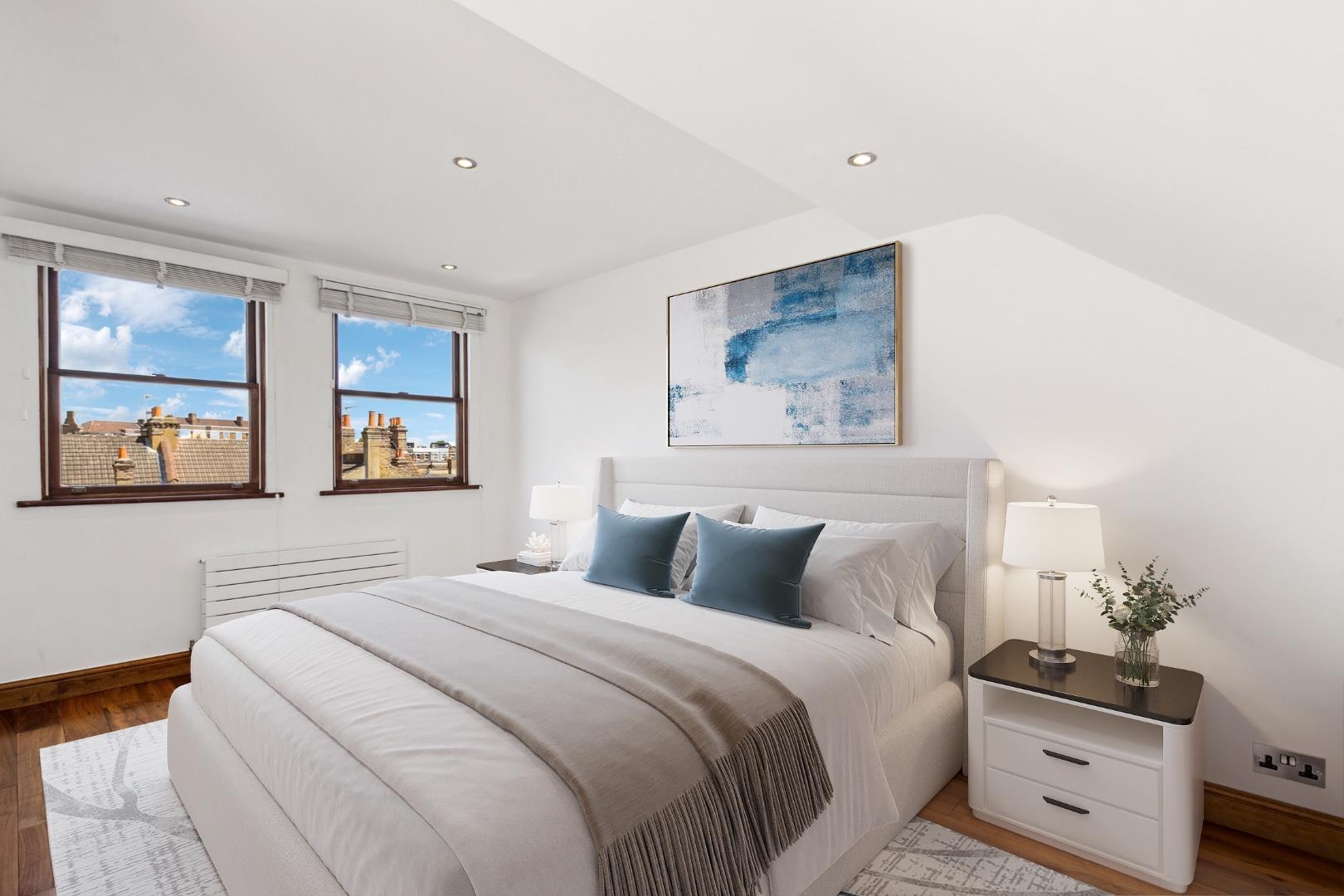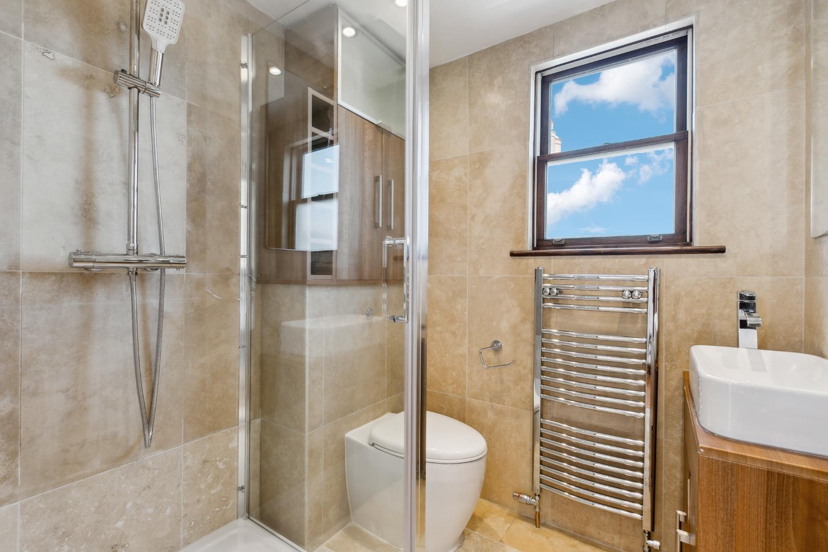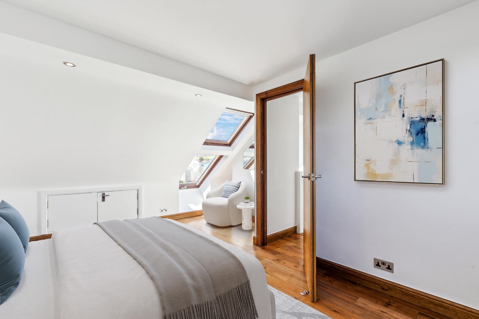 Double aspect bright and airy 15'6 bedroom with wooden floors and under eaves storage and well appointed shower room.