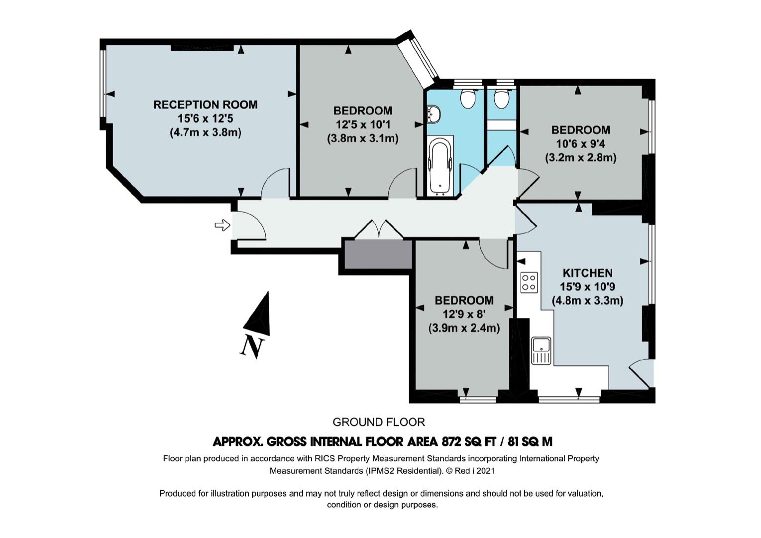 The accommodation comprises: entrance hallway with large storage cupboards, 15' reception room, 16'5 kitchen/dining room, three double bedrooms, separate w.c. and recently refurbished bathroom.